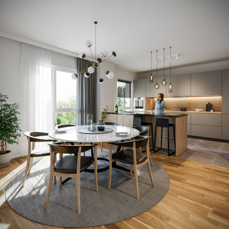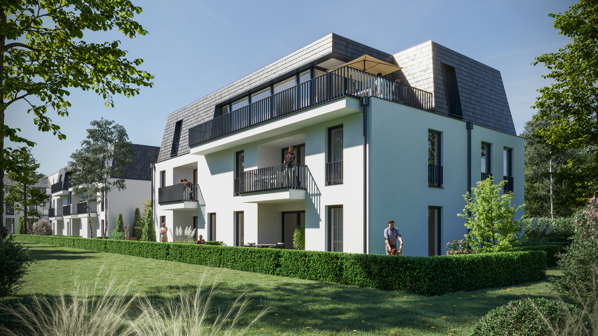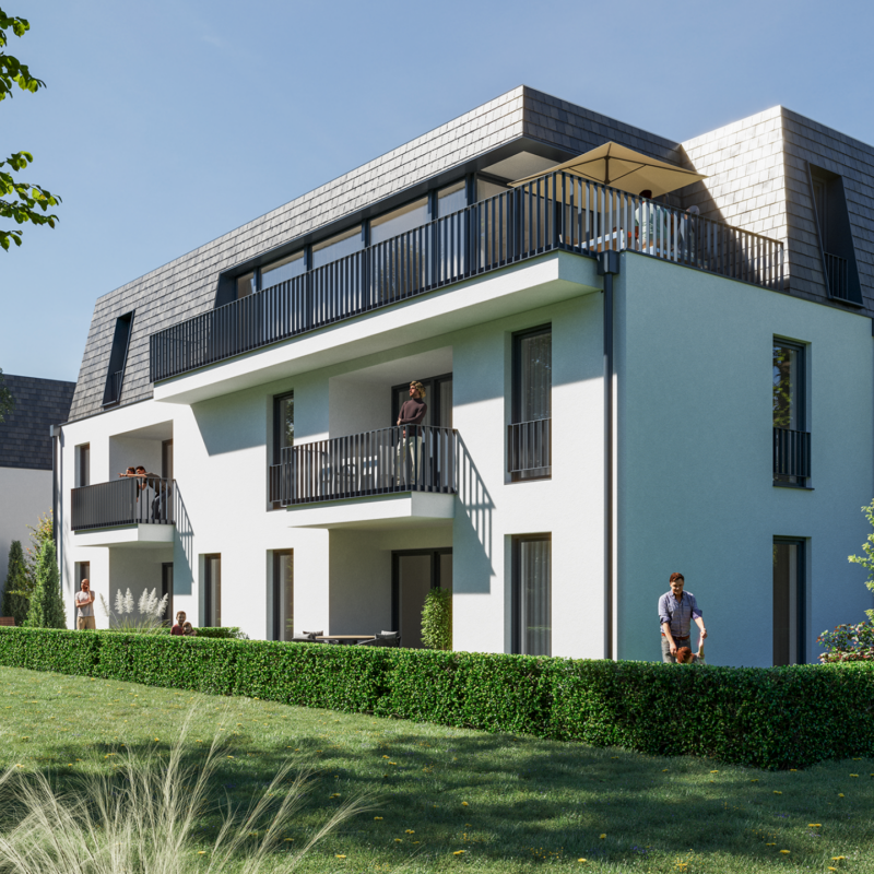 Die Visualisierungen der Gebäude und Außenanlagen stellen Gestaltungsstudien des Architekten dar. Sie dienen dem besseren Verständnis von Gebäudekubatur und städtebaulicher Einbindung. Abweichungen in Ausführung, Materialität, Farbgebung oder Umfang bleiben vorbehalten.